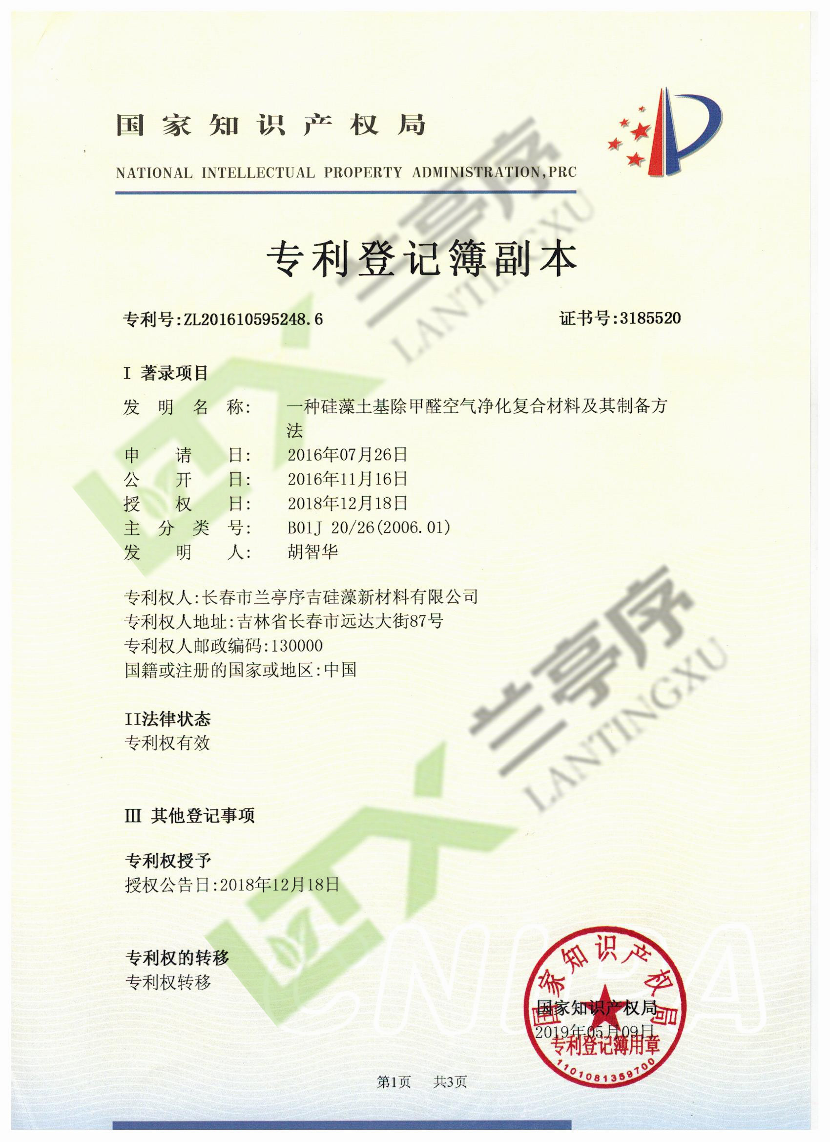 蘭亭序硅藻泥榮獲了一項名為“一種硅藻土基除甲醛空氣凈化復合材料及其制備方法”的國家專利認證。蘭亭序?qū)W⒂谔m亭序品牌硅藻泥的研發(fā)和生產(chǎn),具備完善的產(chǎn)品體系。蘭亭序硅藻泥能獲此殊榮,對整個企業(yè)來說都是振奮人心的事。2019年,蘭亭序?qū)⒗^續(xù)努力,為環(huán)保開辟更廣闊的天地。